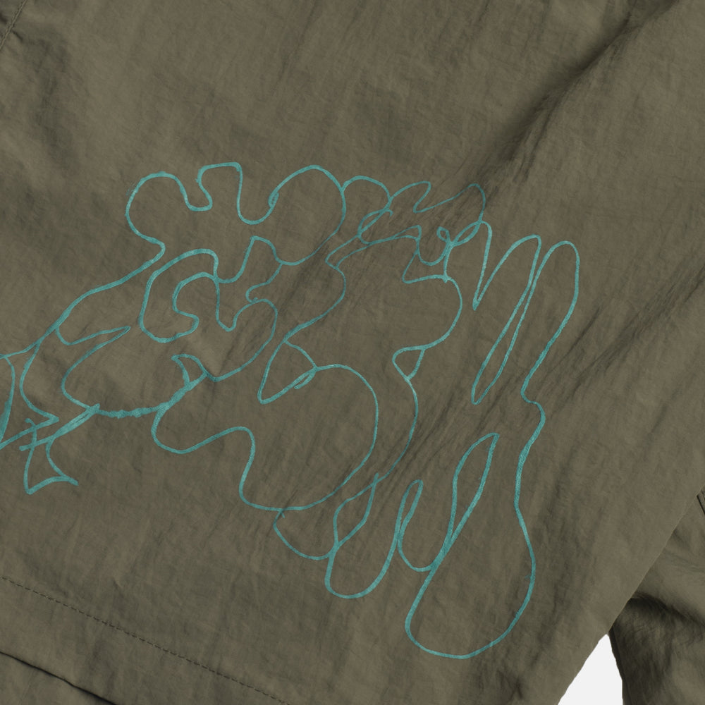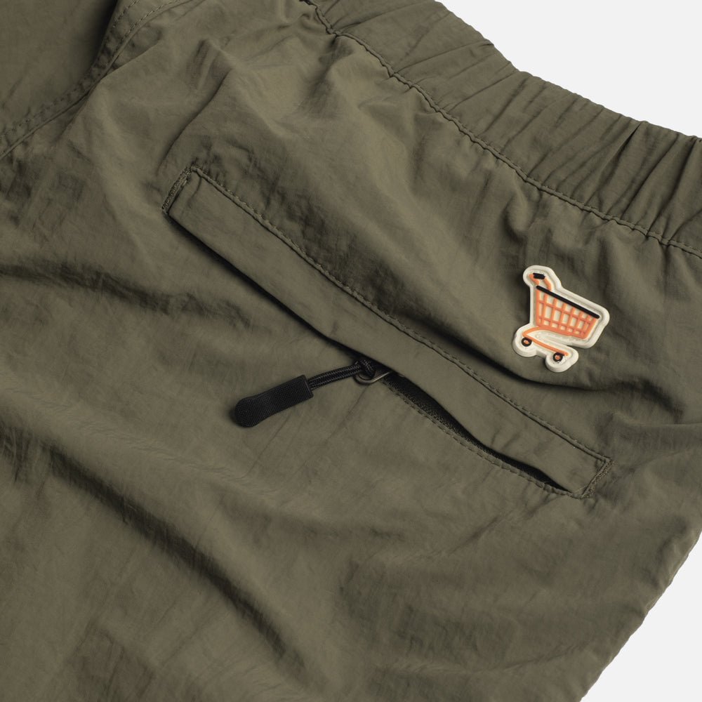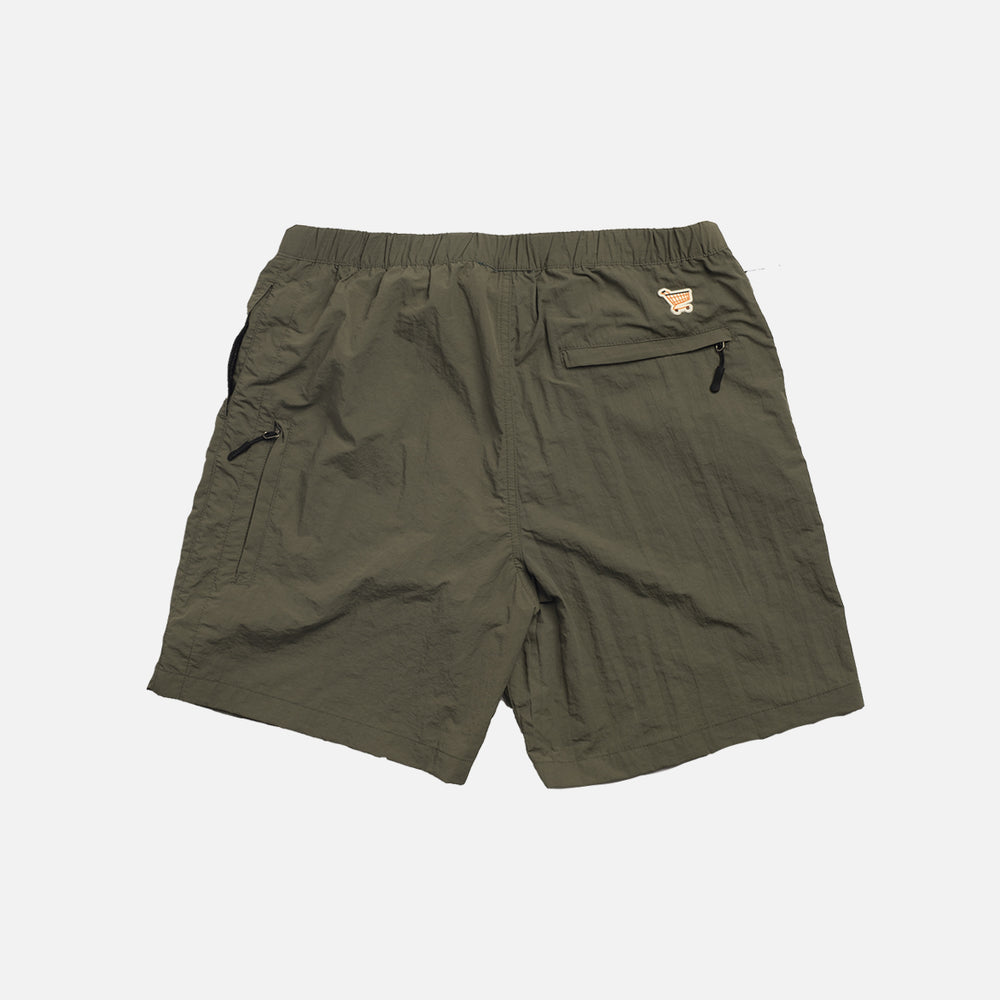 The Glim Mountain Climber Shorts are 100% nylon hiking-style shorts that feature a DTG print on the left leg of a Glim wordmark hand drawn by the artist Julia Renegade Angel. The shorts feature an elastic waist with an attached webbed belt, two side pockets, back zipper pocket and a PVC cart below the back waist.