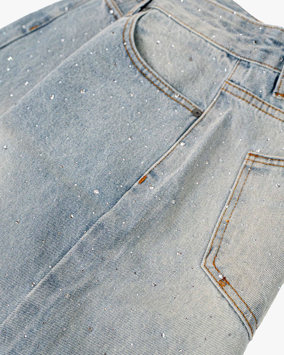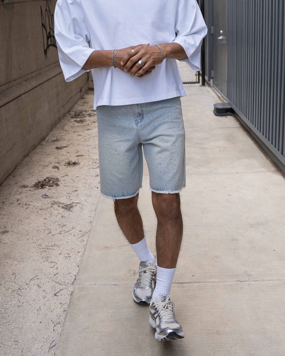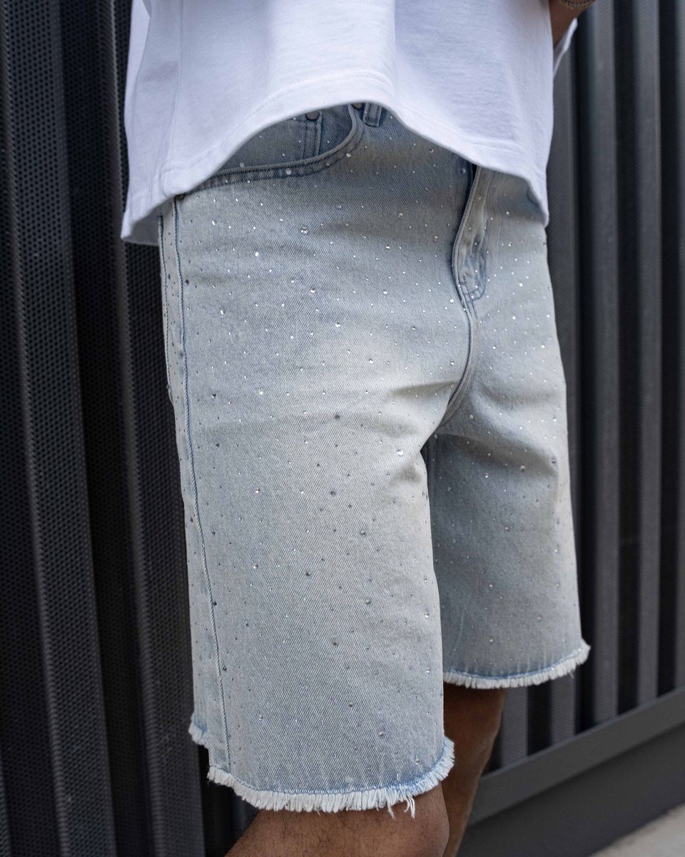 The Crystal Denim Shorts is a 5 pocket short with a raw edge hem and rhinestone crystals throughout.