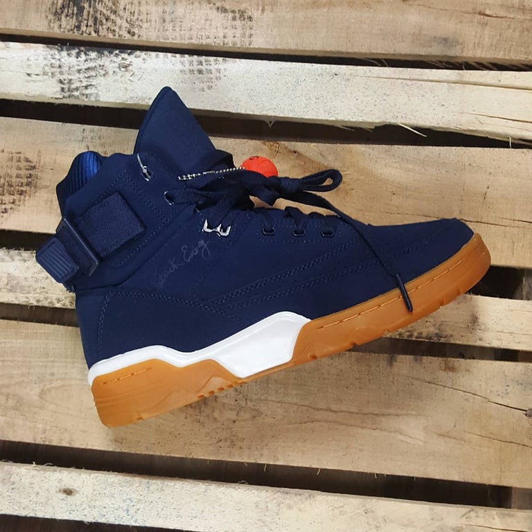 The flagship Ewing Athletics shoe, the 33 HI is an exact retro of the 1990 original, and features a classic reversible ankle strap that can be worn on the front or back of the shoe, and a full length PU midsole for cushioning. The classic silhouette has been redone fresh for Autumn with a tonal Navy premium suede upper set atop our classic sole.