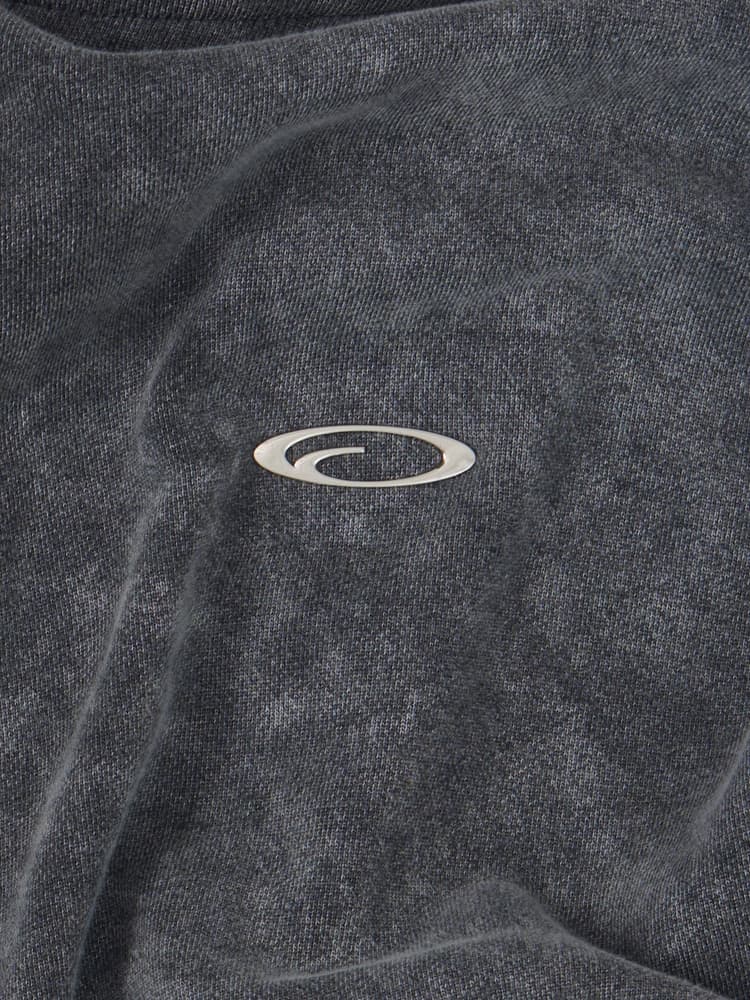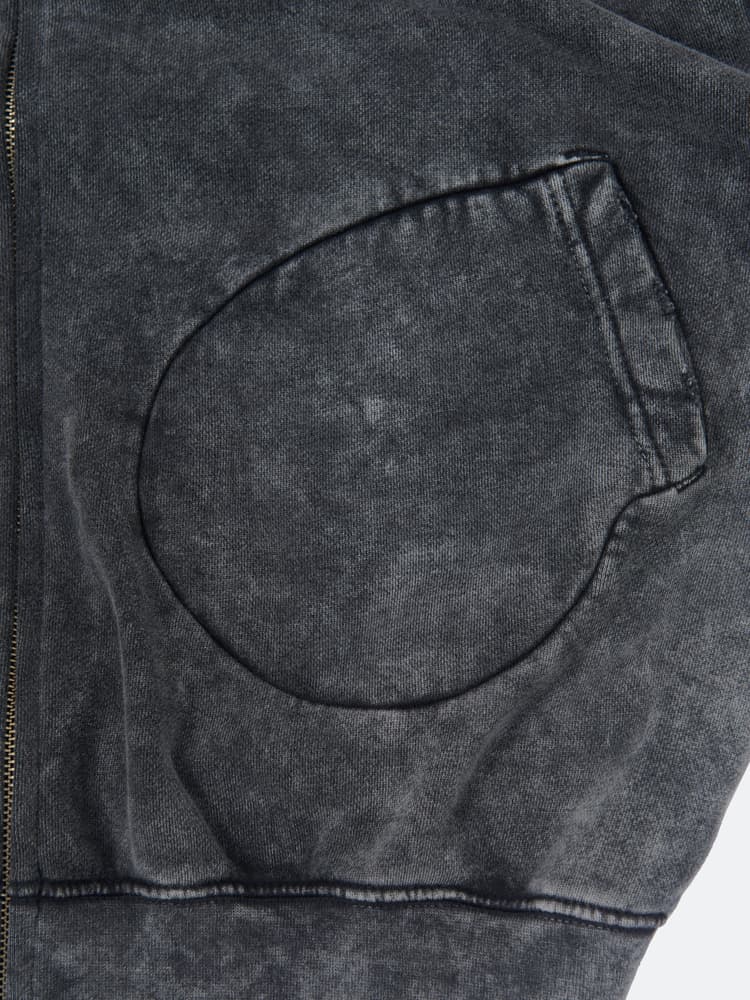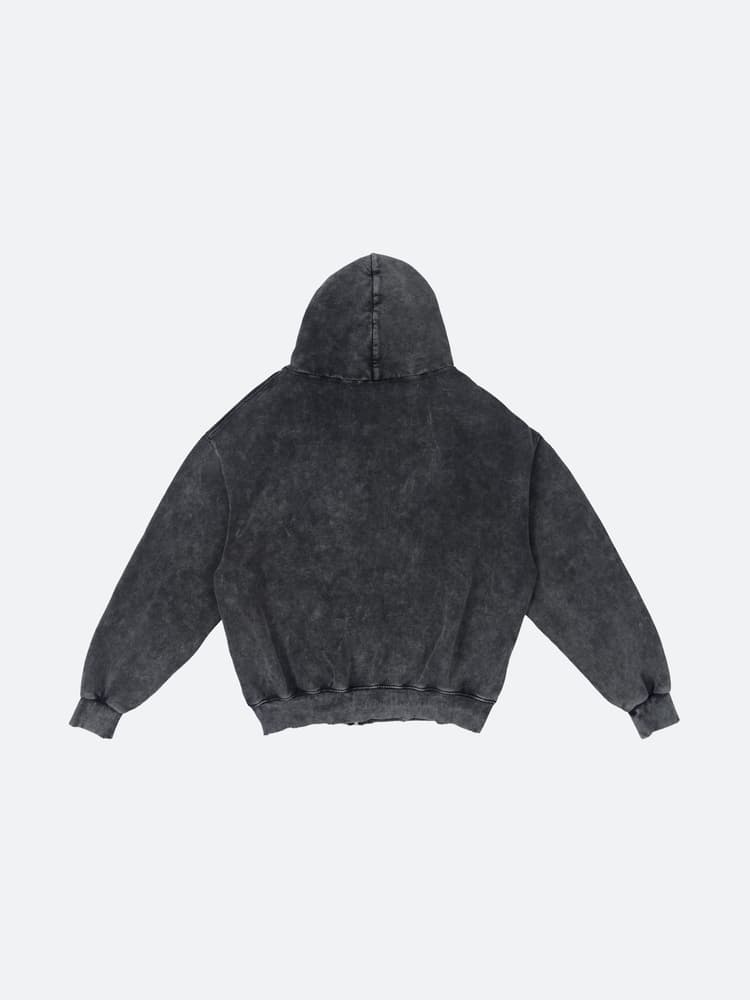 The hoodie is cut to a boxy fit with slightly dropped shoulders, boxing pockets, rib-knit waist hem, and cuffs. Crafted from French Terry cotton with vintage washed finish. Detailed with metal symbol on the chest, along with a closure zipper.