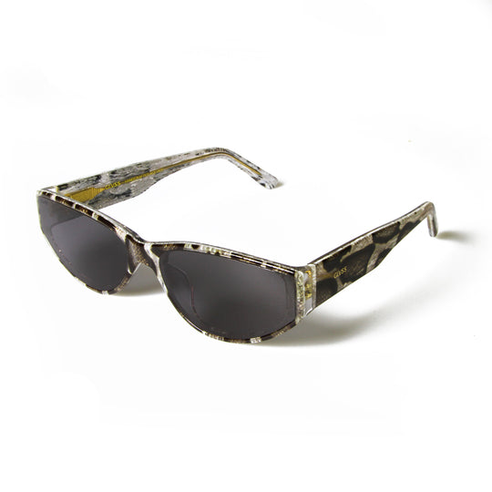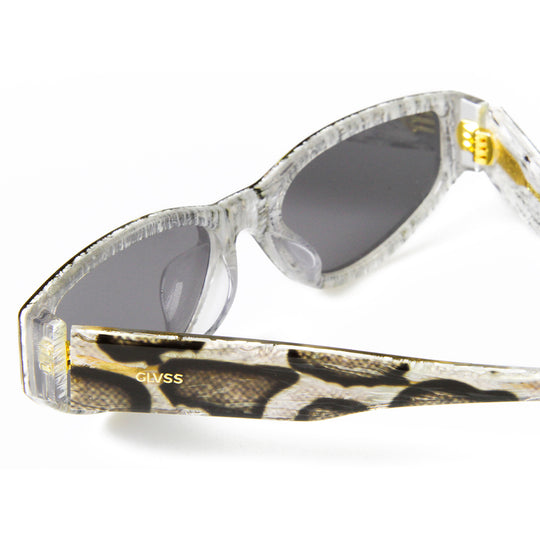 The newly designed SNAKE is a sleek aerodynamic shape with a thick acetate design and flush lenses. The SNAKE’s sports-inspired shape was made to form a unique profile with curved lines, thick nose bridge and wide temples. This version of the SNAKE features smoke lenses and Snakeskin acetate.