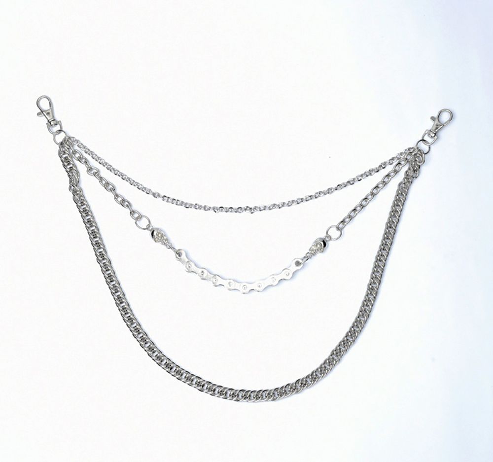 2025 SS TRONIX – Industrial Chain Wallet Strap (Multi-Layer) Raw. Functional. Fearless. The TRONIX wallet chain fuses biker grit with mechanical attitude. Featuring three distinct chain styles, including a heavy-duty bicycle gear-inspired segment, this piece makes a bold utility statement while holding down your fit. Built with dual clasp ends, it clips cleanly to belt loops, bags, or even as a neck-layered accessory. Material: Alloy + industrial chain components Color: Silver steel (Code: TRONIX) Design: Three-layer structure with gear-linked centerpiece Style: Unisex / Grunge / Industrial / Biker Function: Use as a wallet chain, key strap, or utility accent Closure: Dual lobster hooks for easy, secure attachment Perfect for: Biker jeans, techwear, utility fashion, or anyone craving a piece that looks like it’s built for the underground.