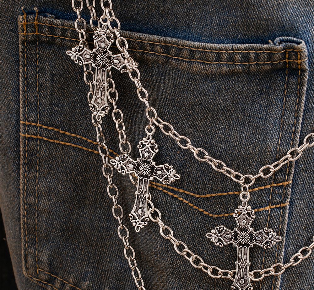 Sacred meets street. The VAULT chain features layered silver chains dripping with ornate cross pendants, delivering a look that’s equal parts gothic iconography and urban edge. Built for versatility, it clips easily as a wallet chain, belt loop accessory, or layered waist chain.