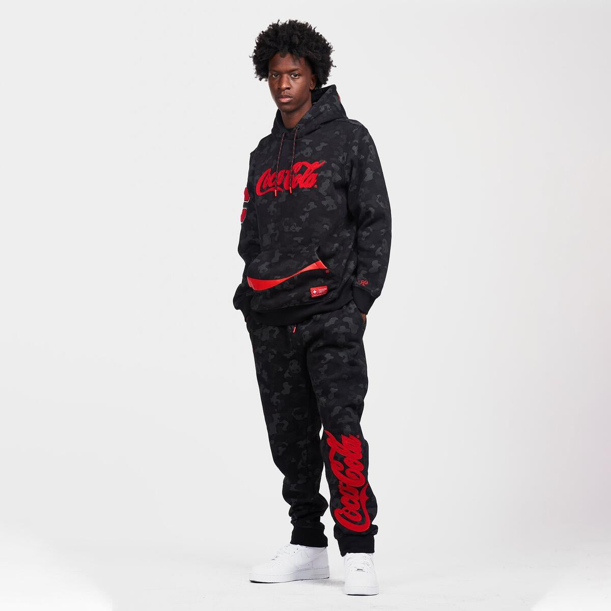 LRG For COCA-COLA® Roots Black Jogger features a custom camo print, a contrast chenille applique logo down left shin, dual tubular cotton drawcords, an elastic waistline, dual on-seam front pockets, and ribbed cuffs at the bottom hem.