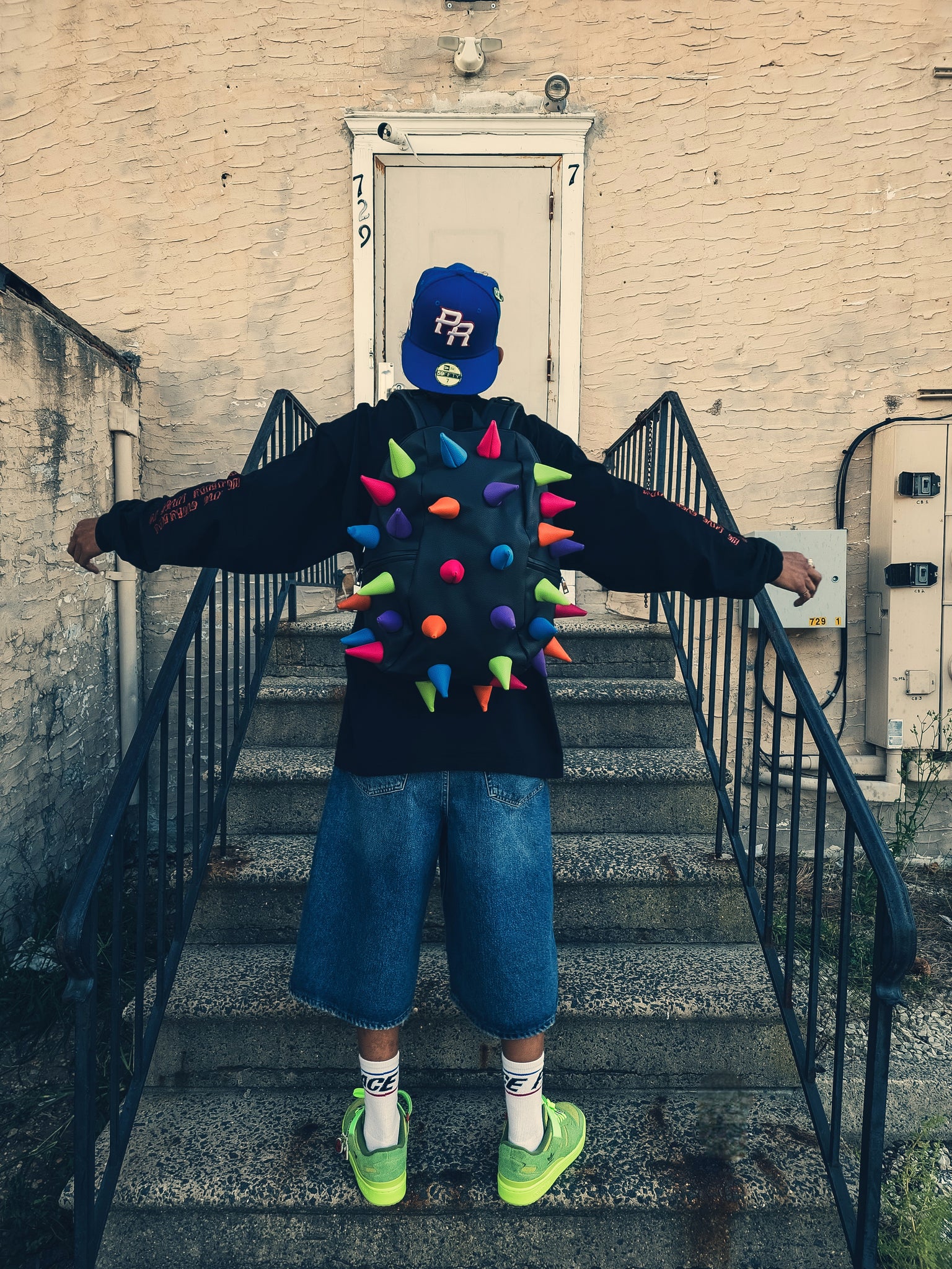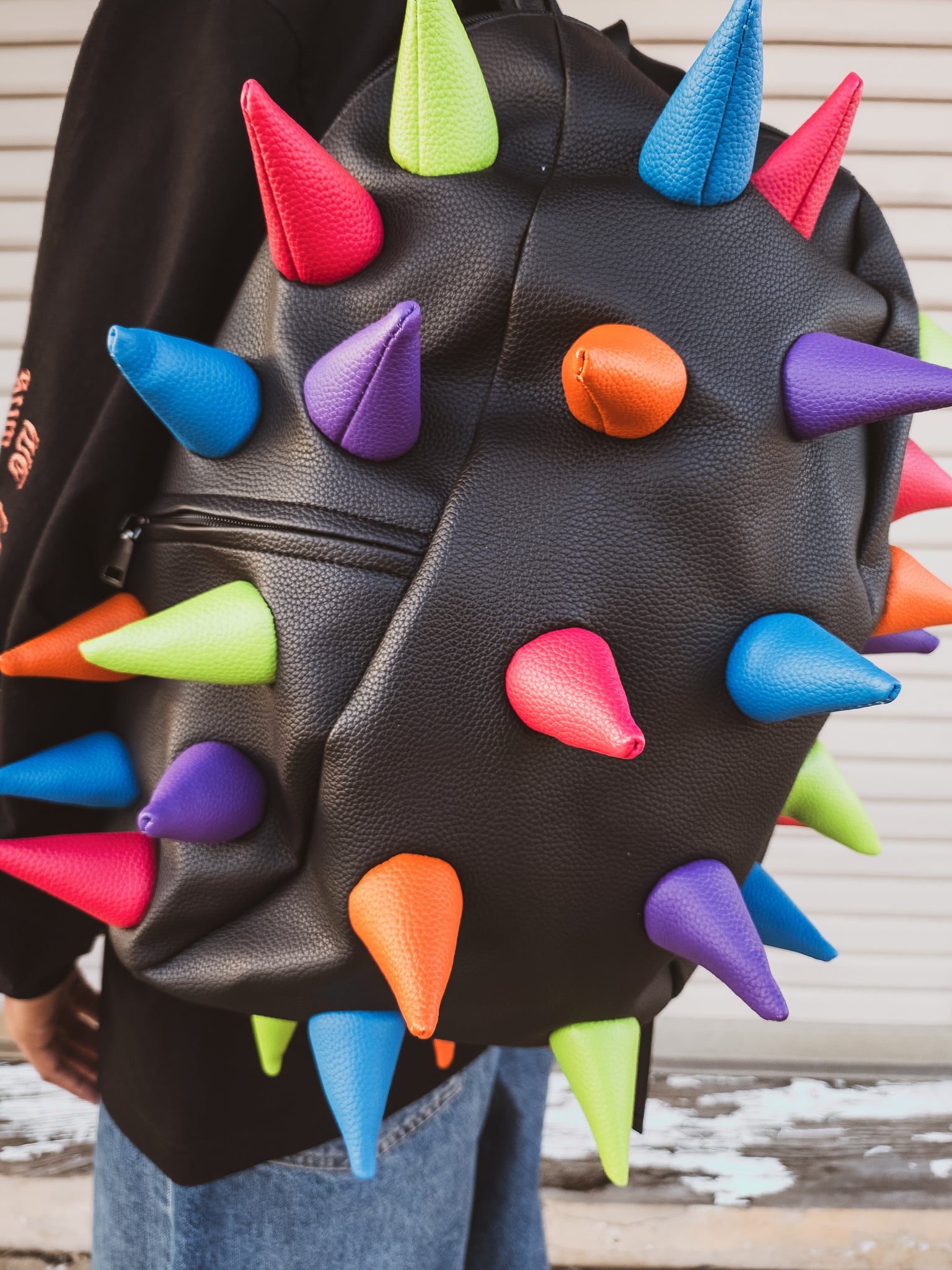 Tired of the ordinary? This multi-colored black backpack is a spellbinding potion of vibrant colors and eye-catching spikes. It's the perfect accessory for those who refuse to fade into the background. Get your groove on with this unique backpack bursting style.