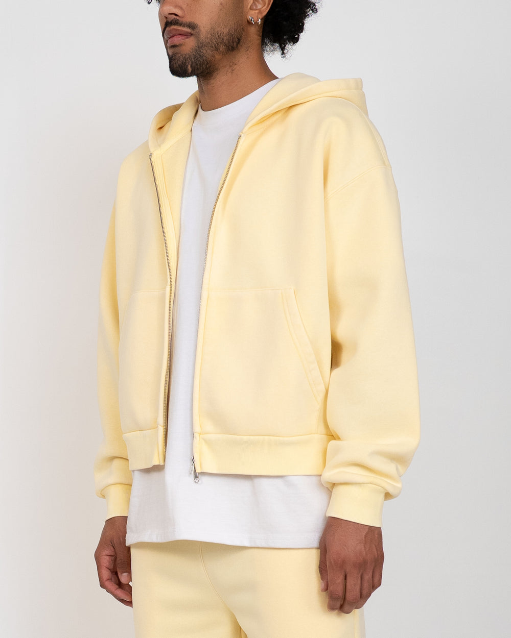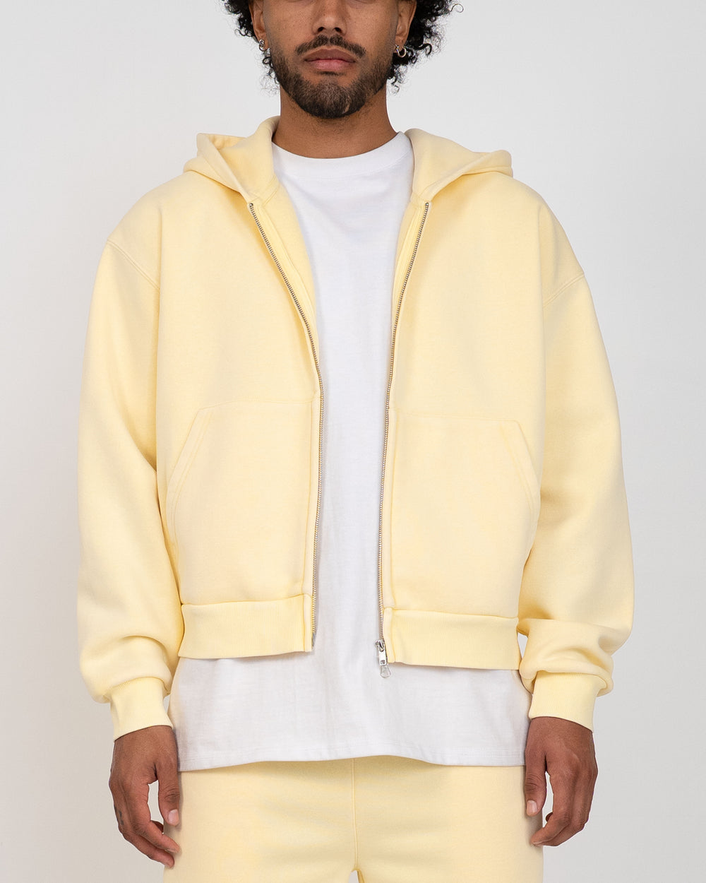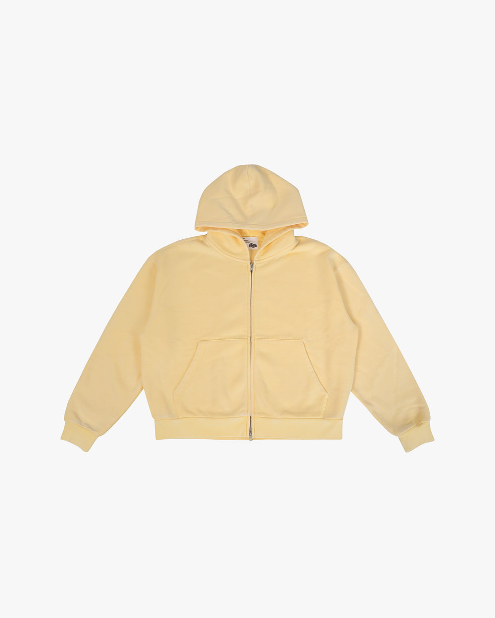 The Vintage Zip Up Hoodie is crafted with heavyweight fleece and finished with a mineral wash for a soft, vintage look. This hoodie is relaxed in the body with a slight crop, and a two-way zipper, allowing for structure and unique styling. Colorway yellow