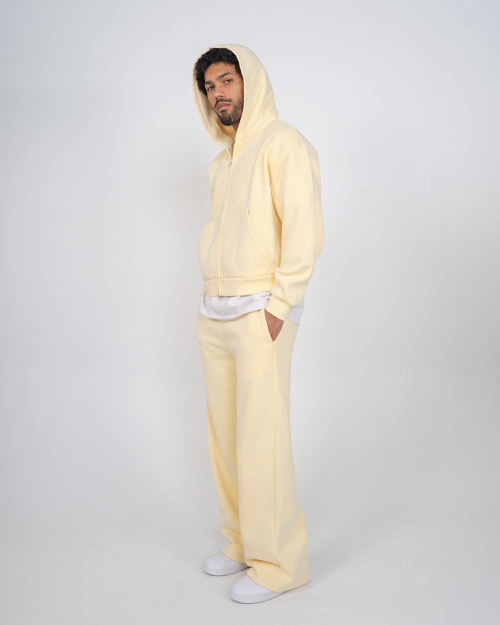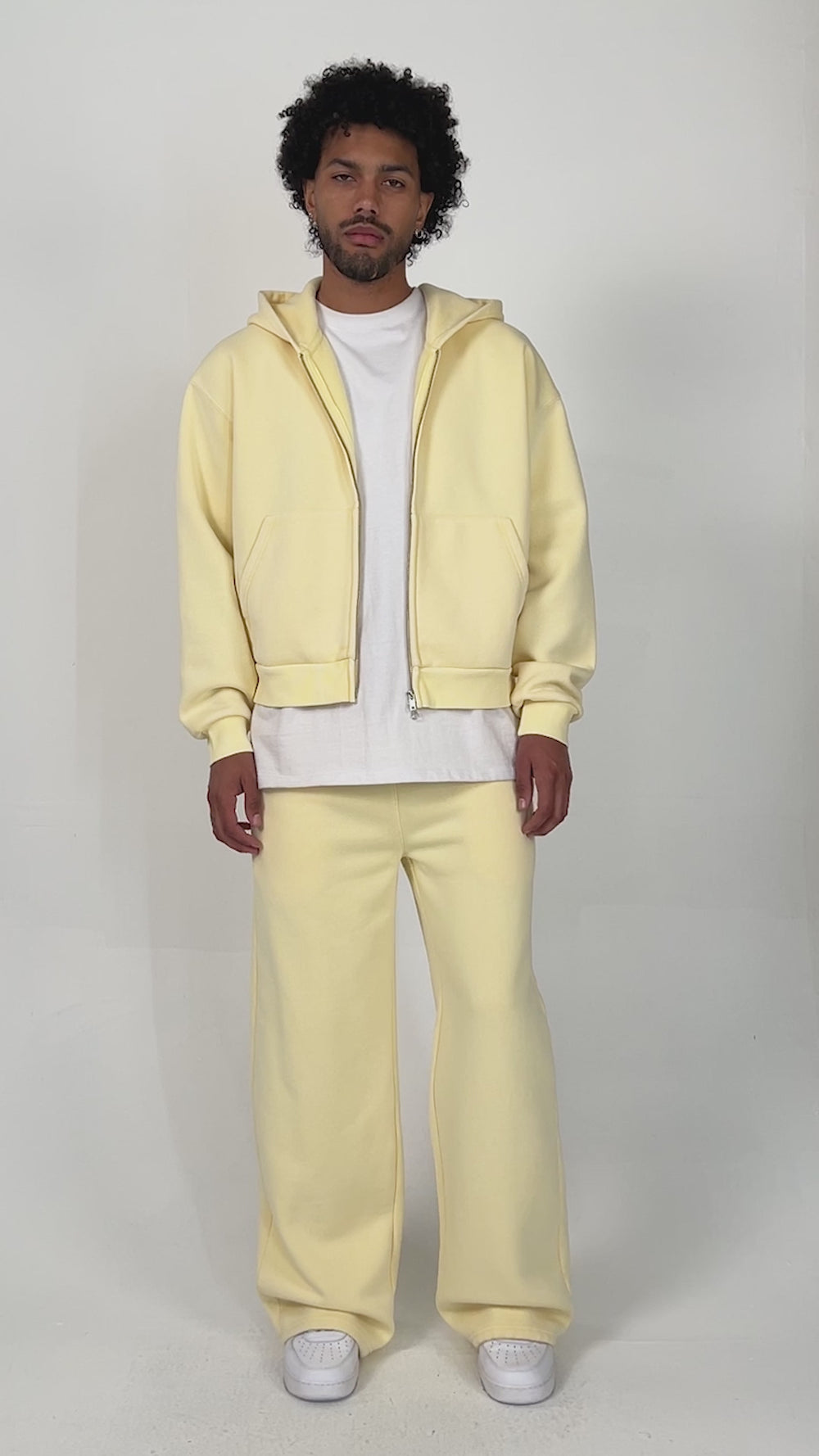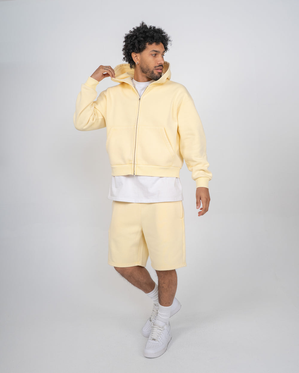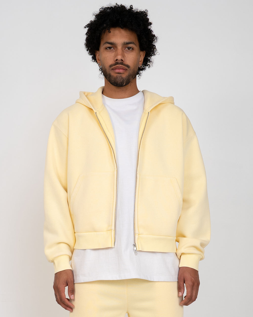 The Vintage Zip Up Hoodie is crafted with heavyweight fleece and finished with a mineral wash for a soft, vintage look. This hoodie is relaxed in the body with a slight crop, and a two-way zipper, allowing for structure and unique styling. Colorway yellow