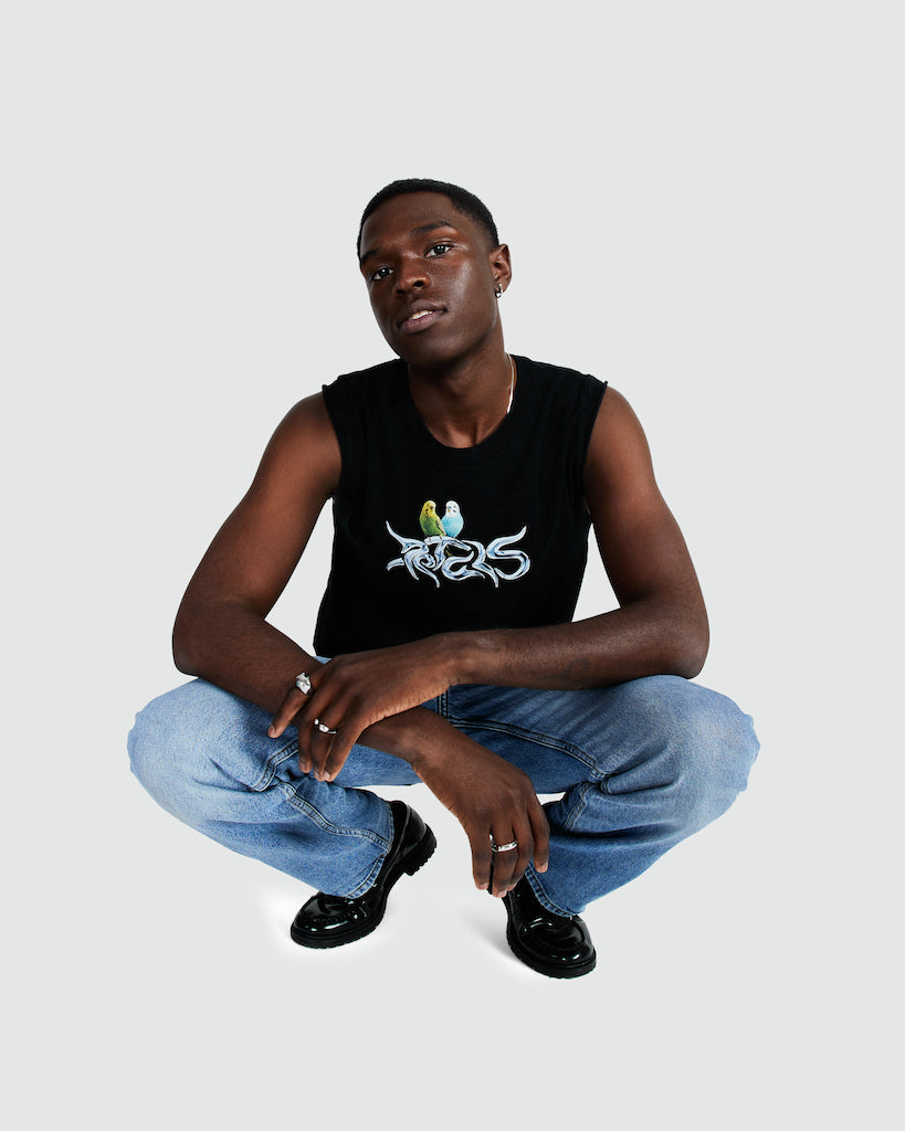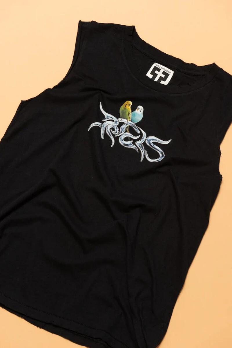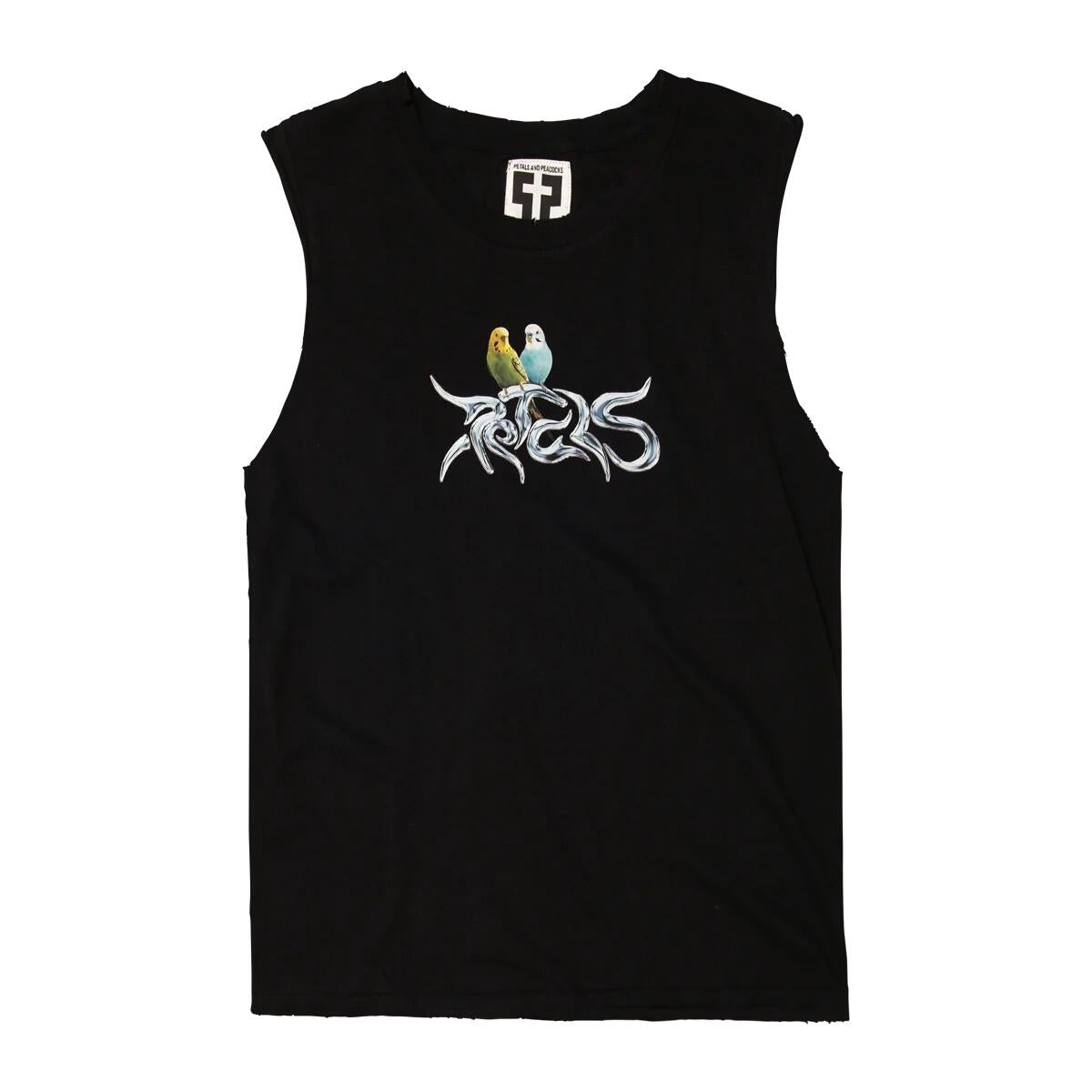 Best budgies 4ever. Screen printed on the signature destroyed tank are two parakeets on a Petals logo. Black destroyed tank top. 100% Cotton . Machine wash cold . Do not tumble dry. Unisex sizing