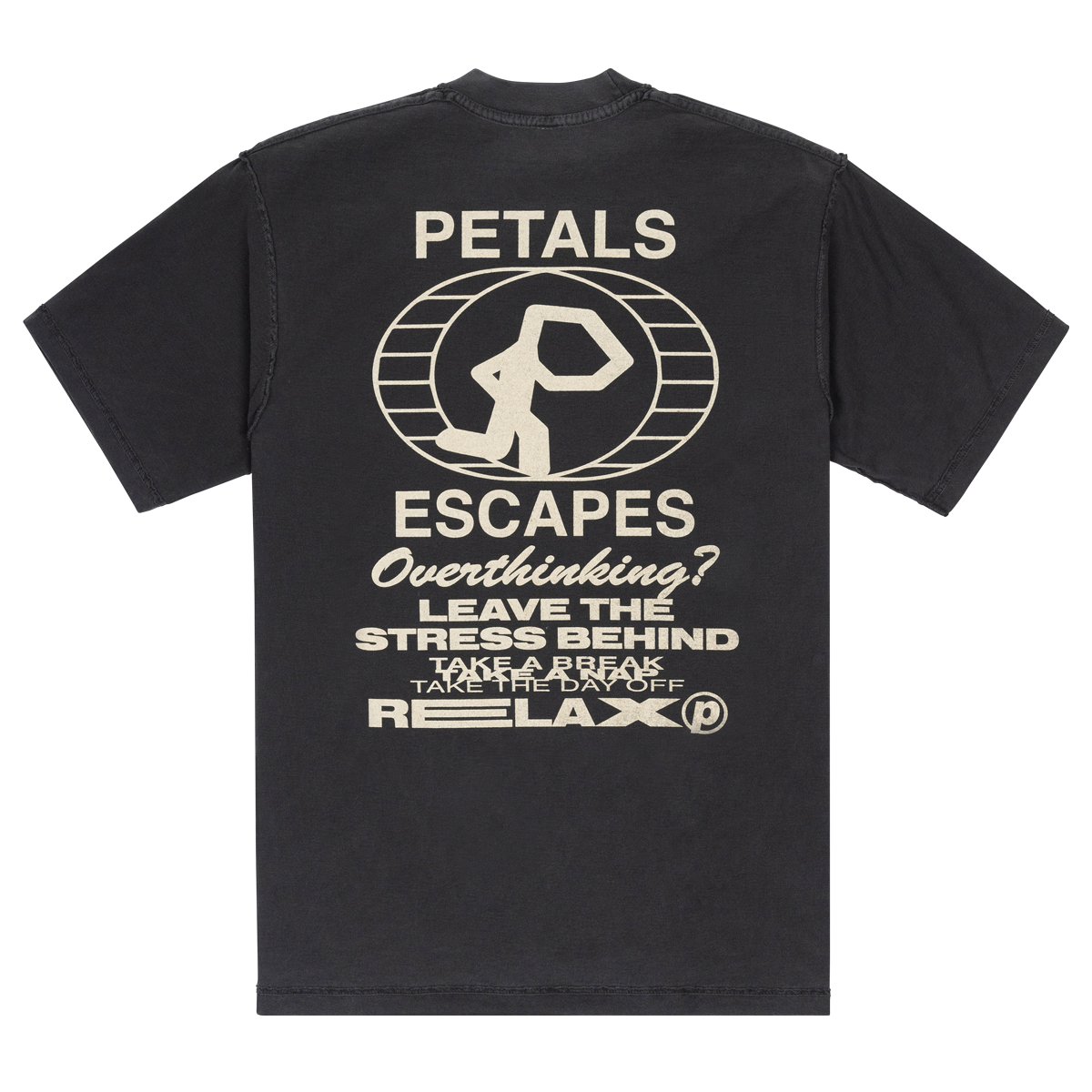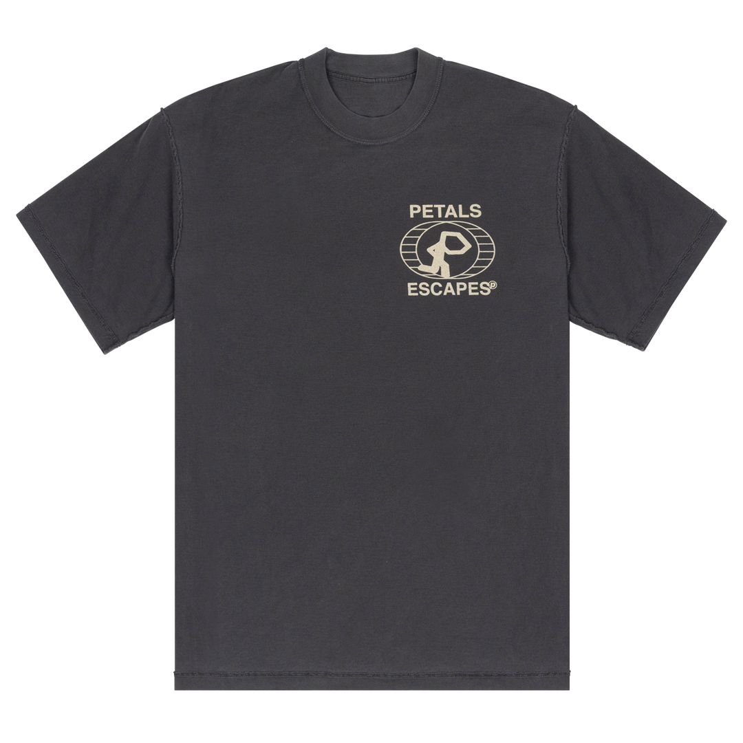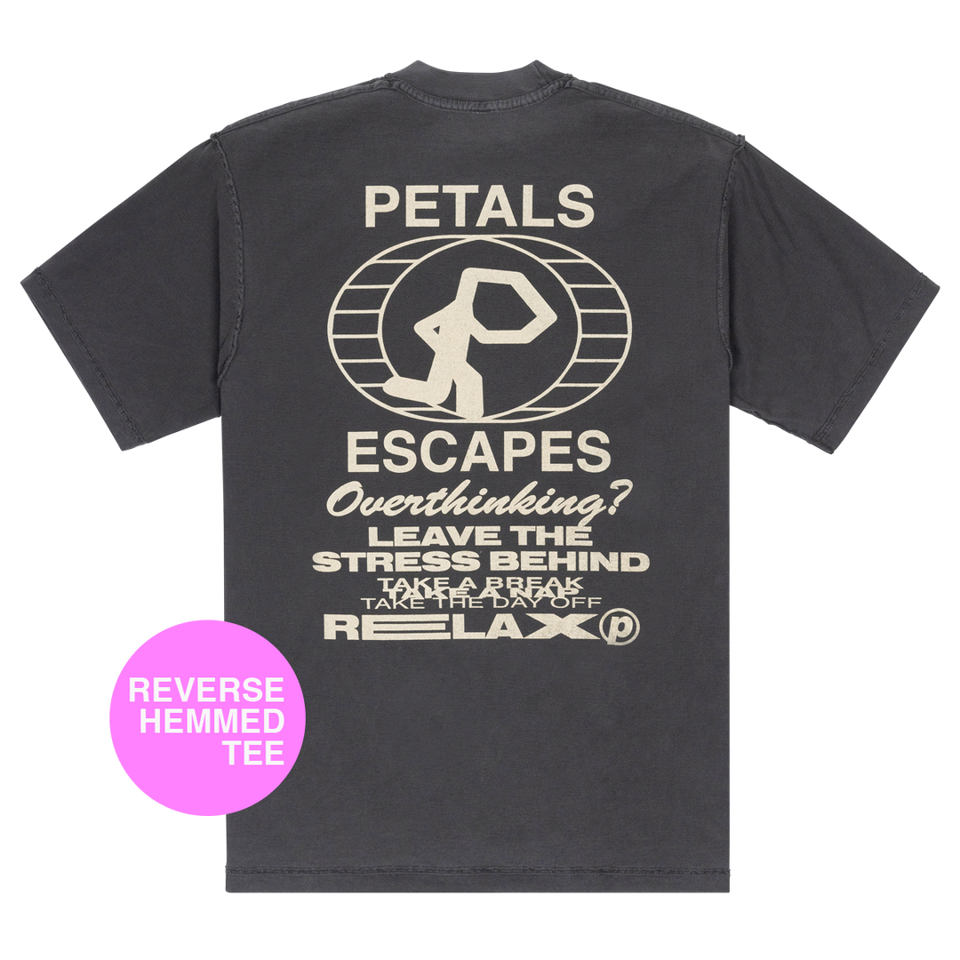 ESCAPE. Leave the stress behind. This reversed hemmed tee features screen printed graphics on both front and back.