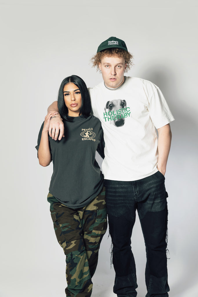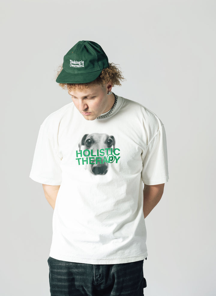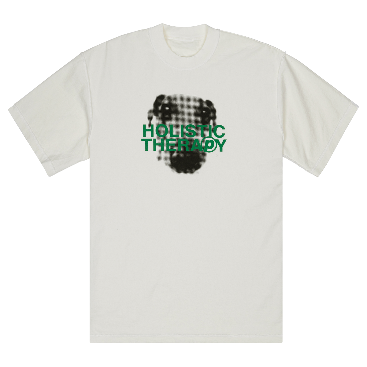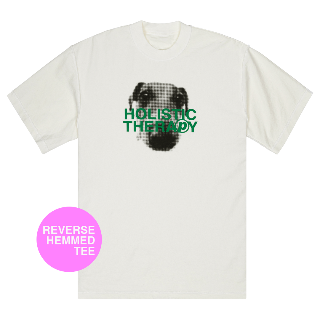 Holistic therapy. This reversed hemmed tee features screen printed graphics on both front and back.