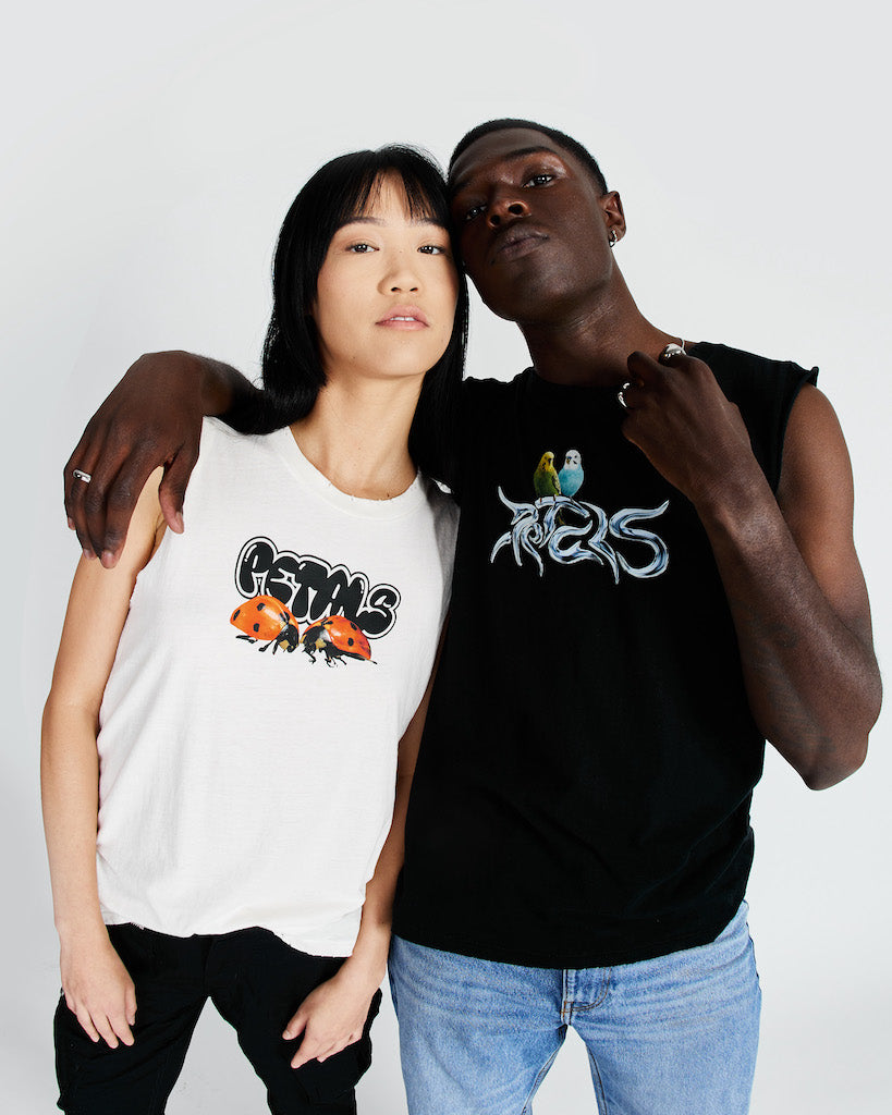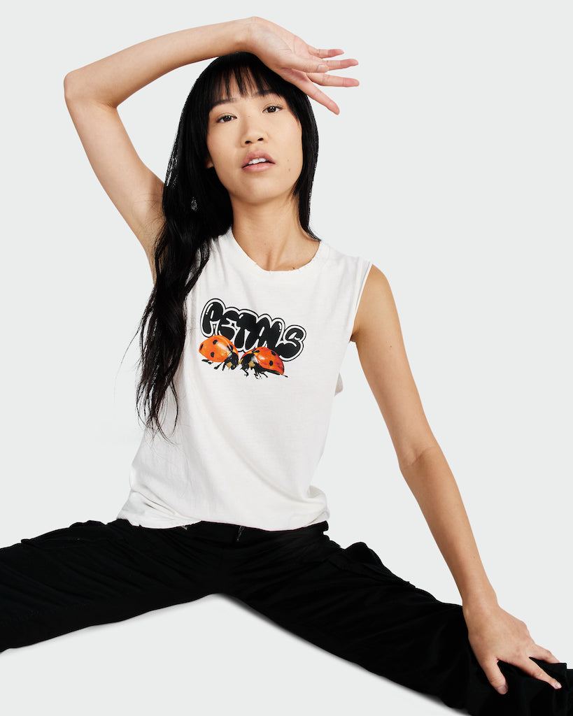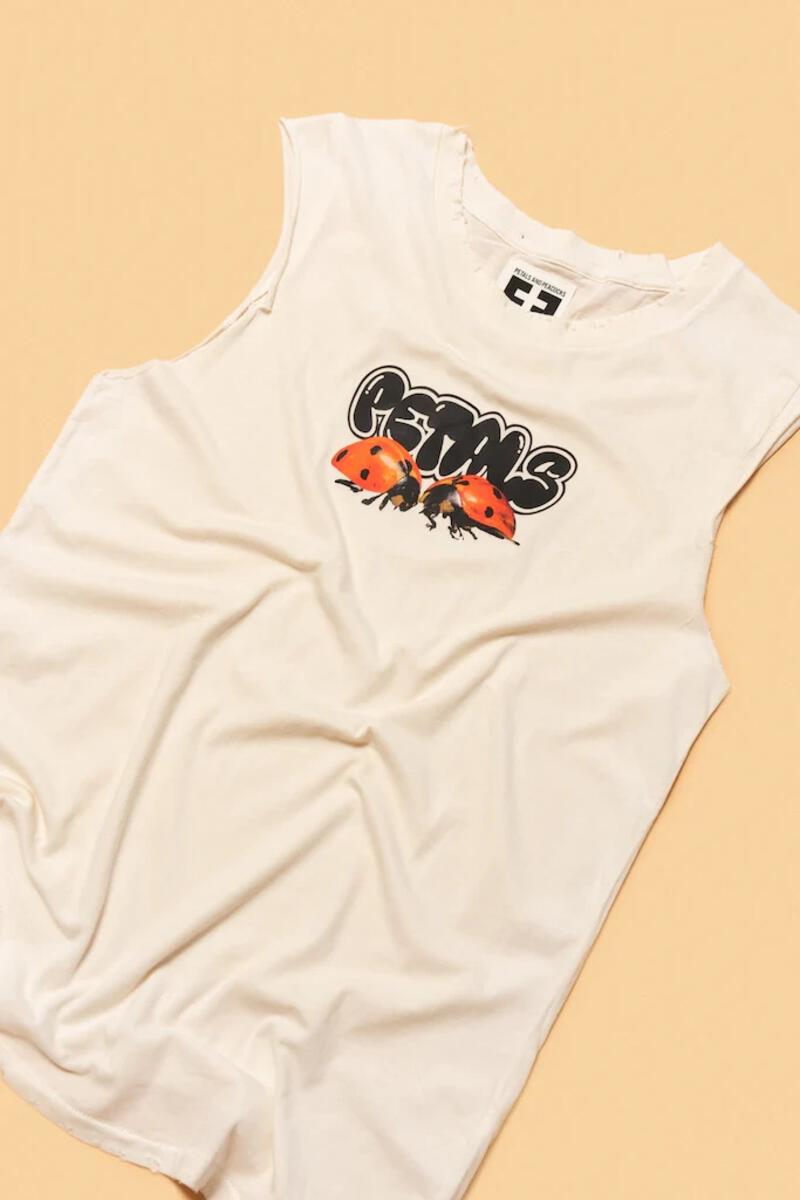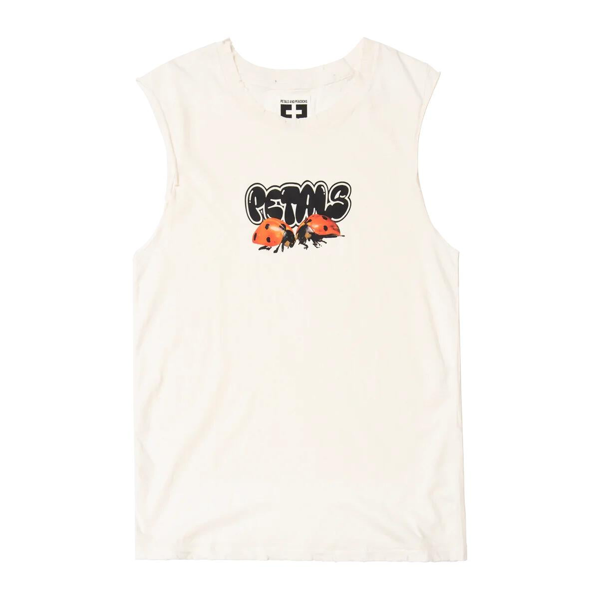 Ladies in red. Screen printed on the signature destroyed tank are two lady bugs on top of a Petals logo. 100% Cotton . Vintage white . Machine wash cold . Do not tumble dry . Unisex sizing