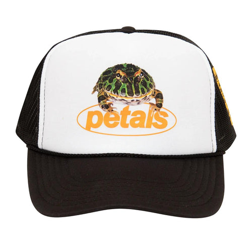 Petals and Peacocks ; kiss the frog trucker hat , blk/wht