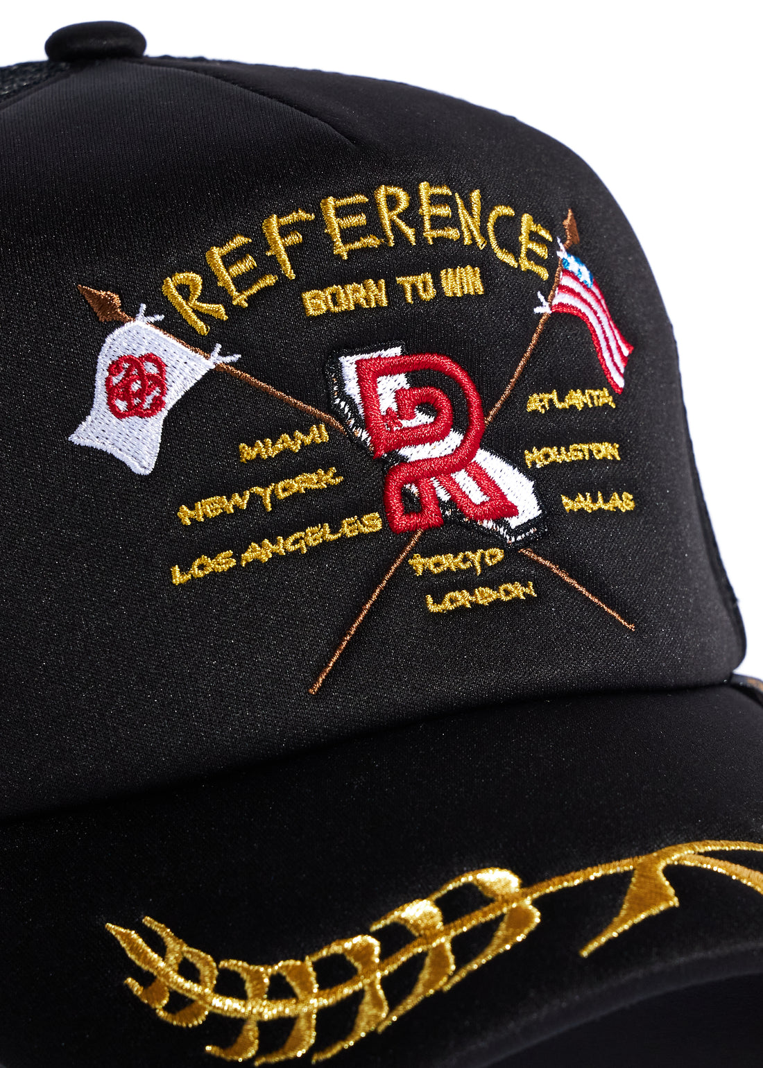 Custom angled trucker hat fully adjustable double row snapback " R" snap Gold tread "Reference" embroidered arched over back of hat . Gold reef brim embroidery .
