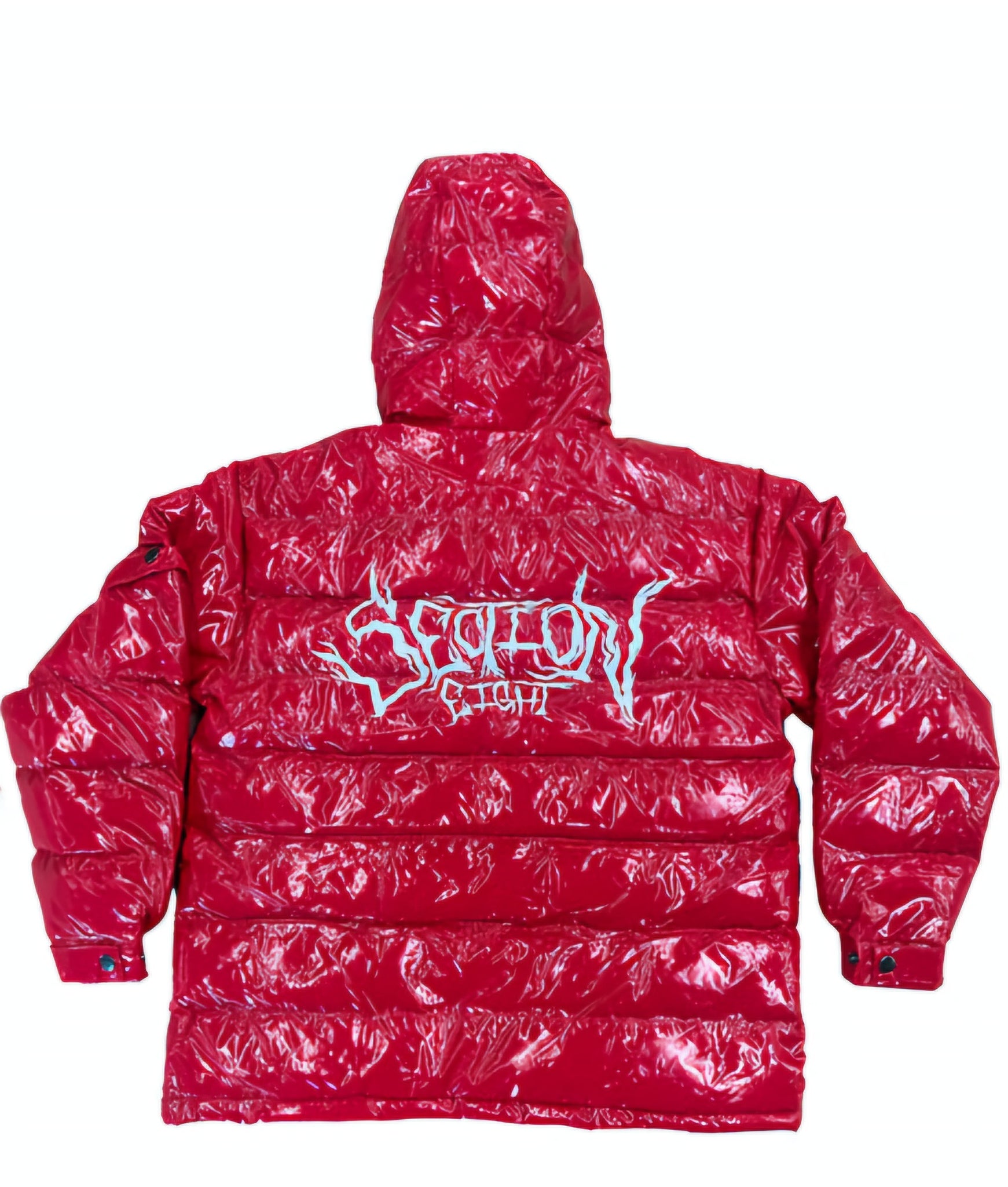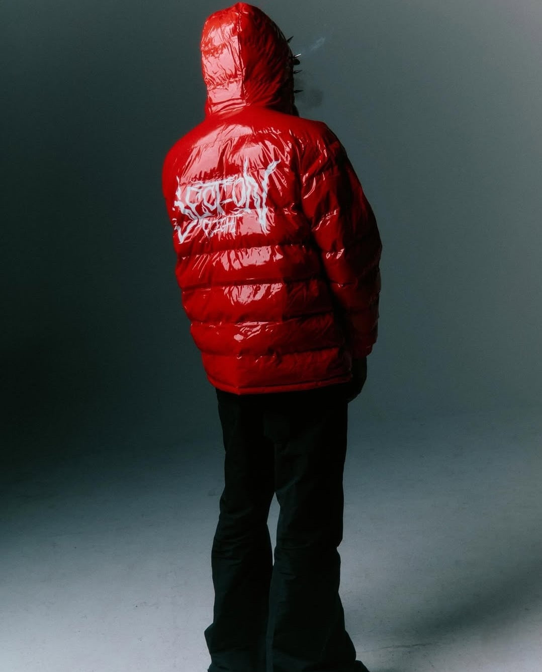 Faux Pu leather bubble jacket with Hardware spikes on the rim of the hoodie . Button adjustable wrist cuffs. Zippered side waist pockets. Screen Printed logo on front and back .