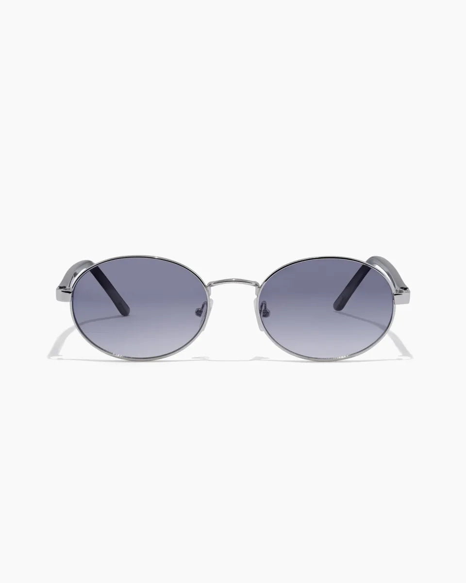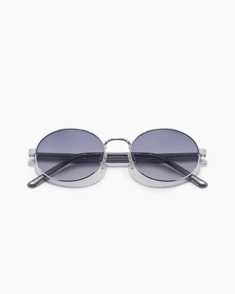 meet finch ; our newest oval frame from our luxe metal series. a timeless style that's always IN. with acetate temples and universally flattering round lenses this polished silver sunglass is a modern must have.