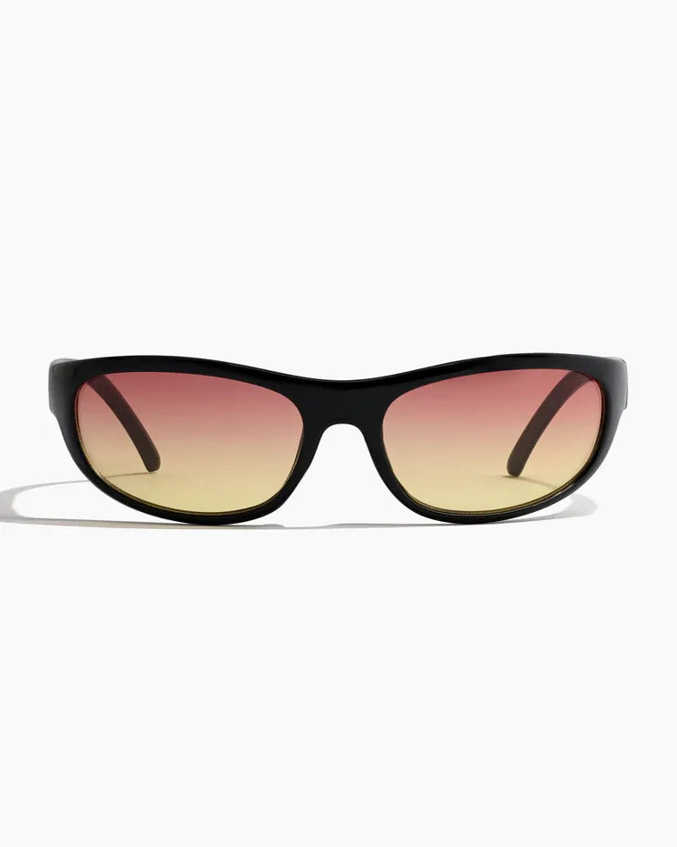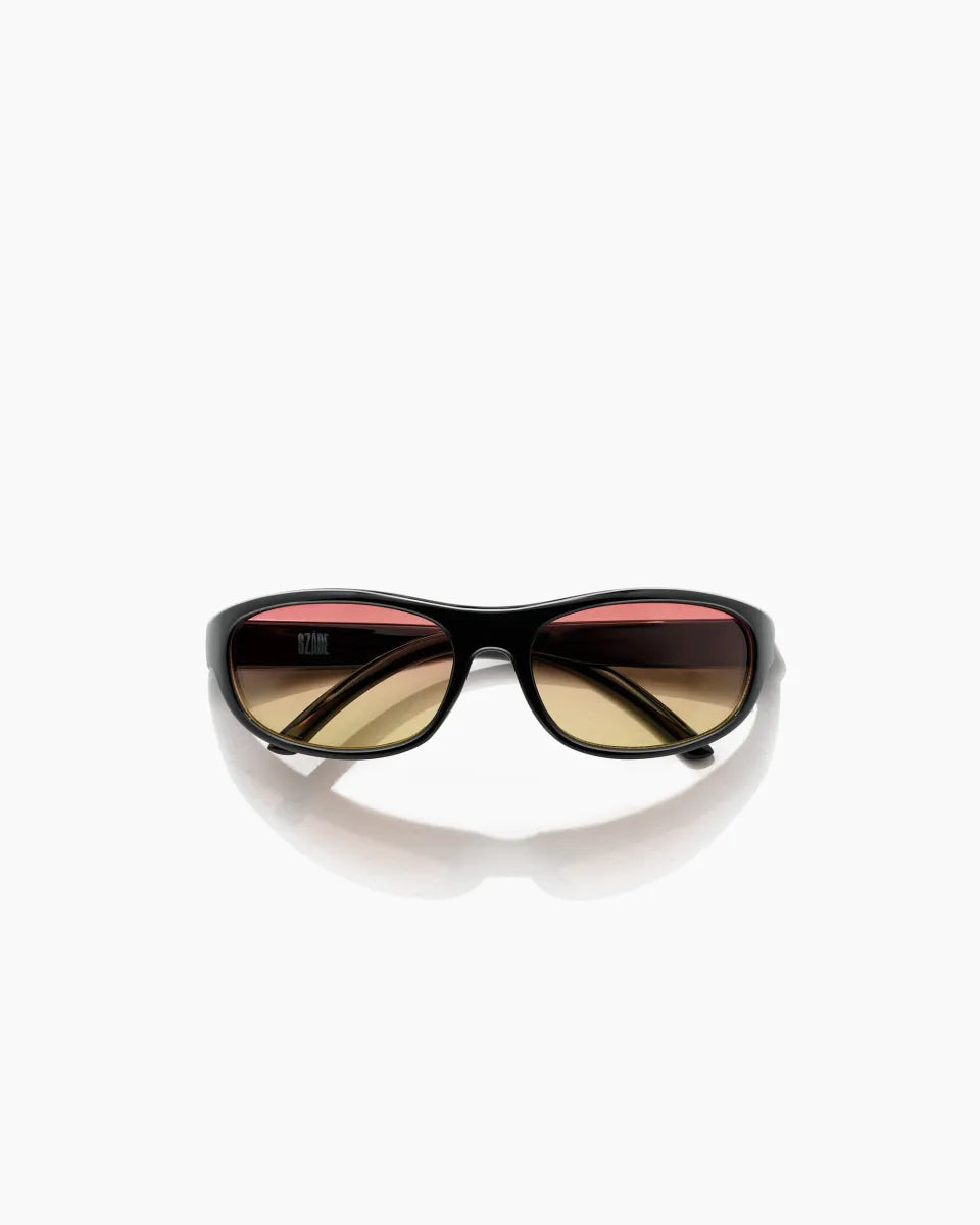 signature szade ; meet traffic, a blacked out, late 90s minimalist wrap frame. hot enough to stop traffic but sporty enough to speed through it and get where you're going. it's a sleeker, chic-er more elevated wrap style in a classic black / tinted frame with the juiciest tequila sunrise two tone lenses. frame material ; sustainable polycarbonate. lens material ; rated polycarbonate. solid lens ; cola burgundy. lens protection ; some reduction of sun glare. blocks UVA/UVB. lens category ; CAT. 2 RECYCLED