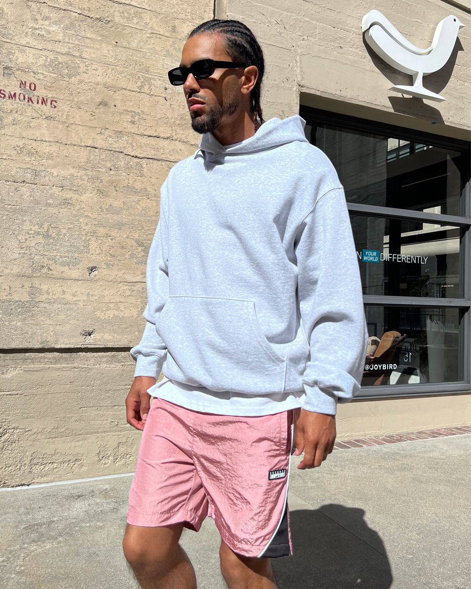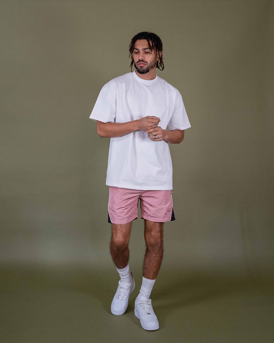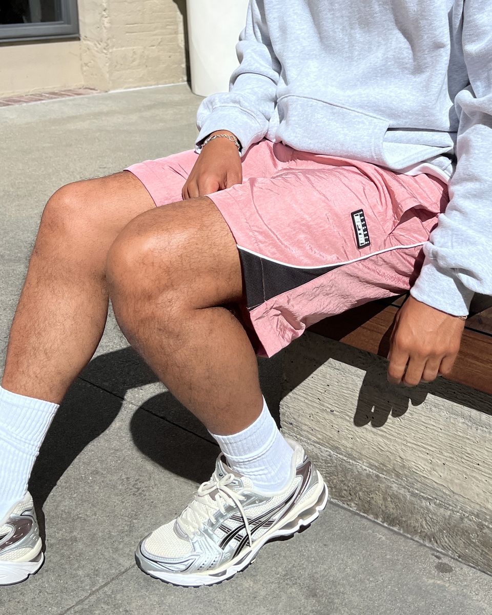 The Dusty pink Derby Shorts boast mesh jersey contrast with white piping and dual hem splits at the legs.