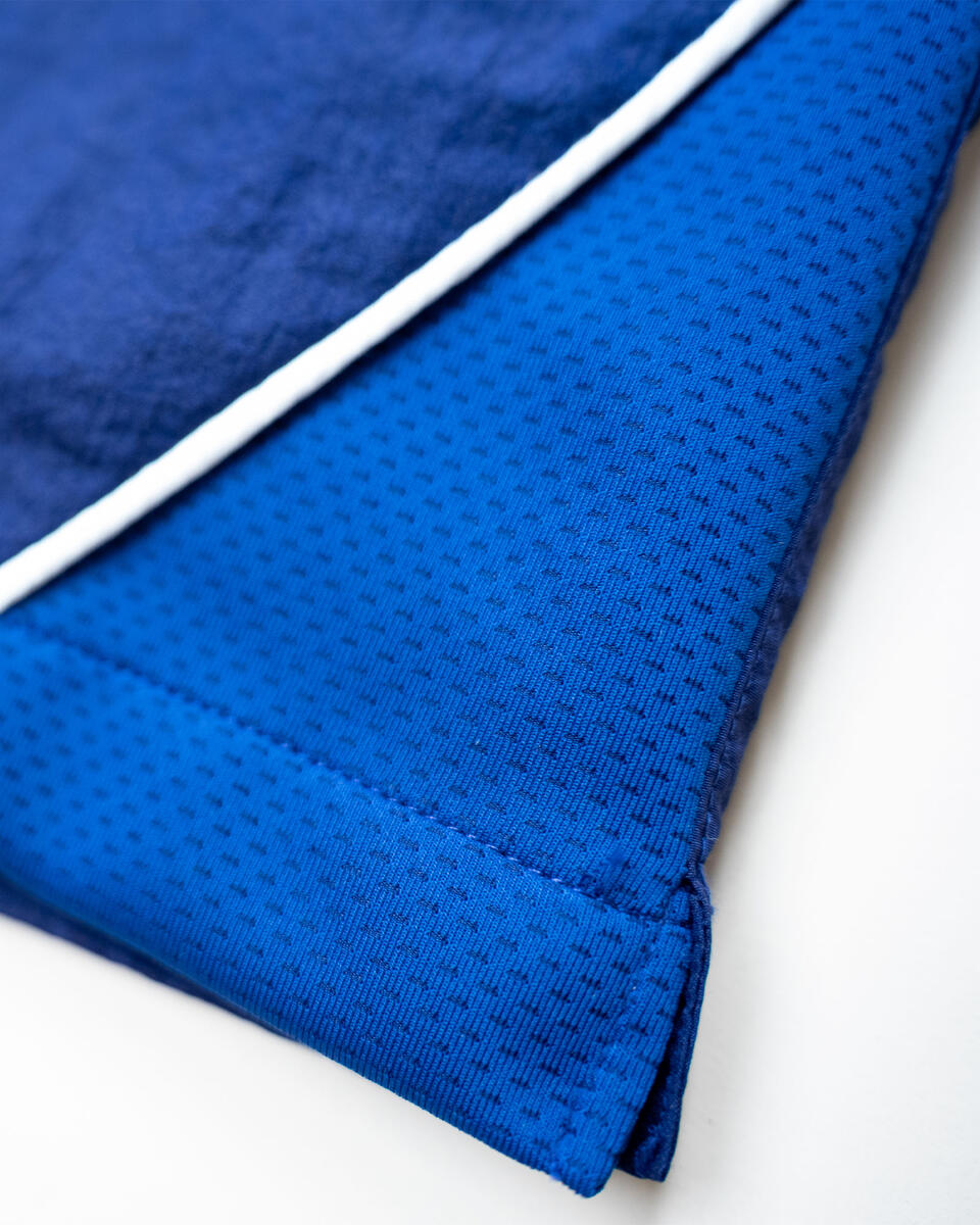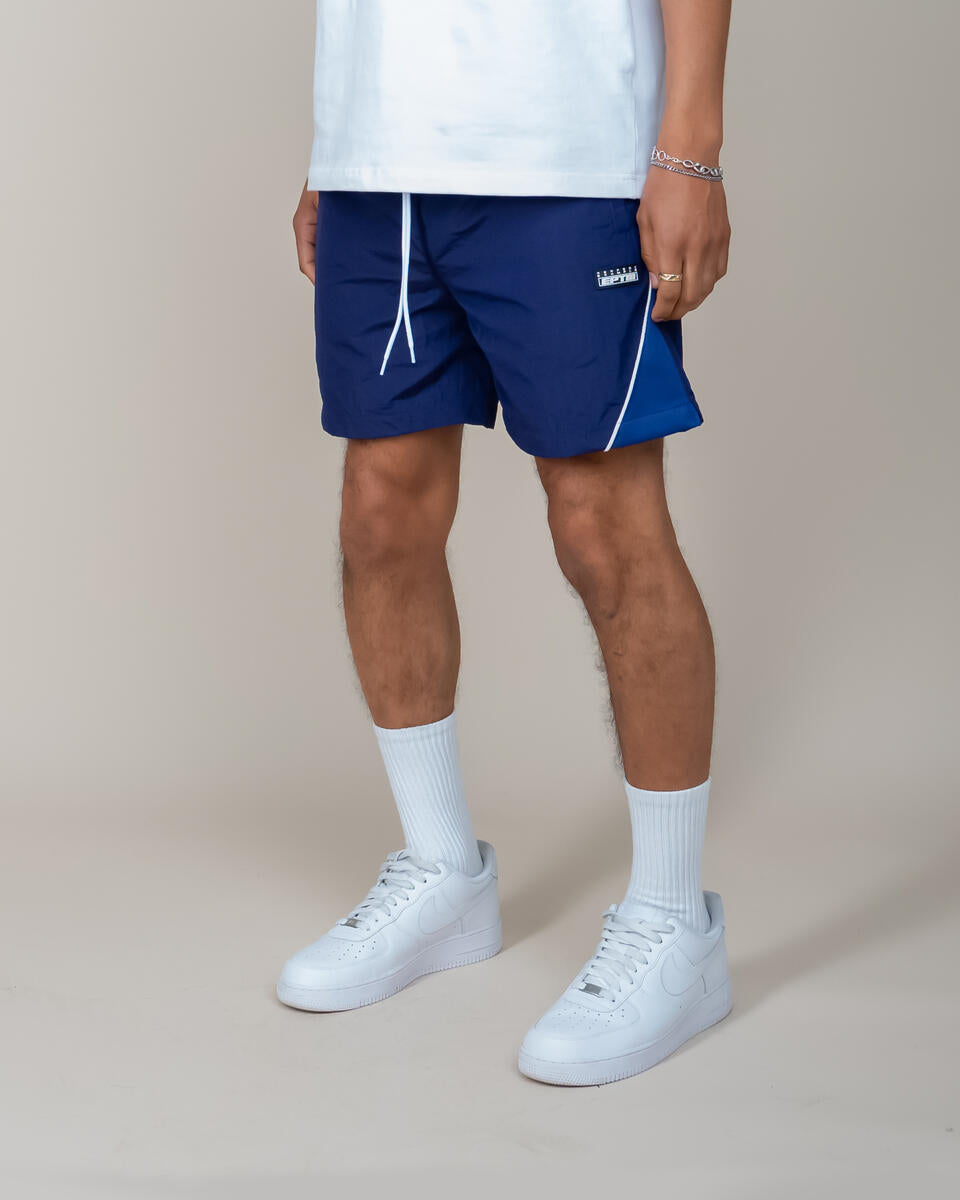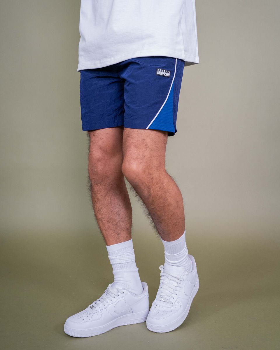 The Navy blue Derby Shorts boast mesh jersey contrast with white piping and dual hem splits at the legs.