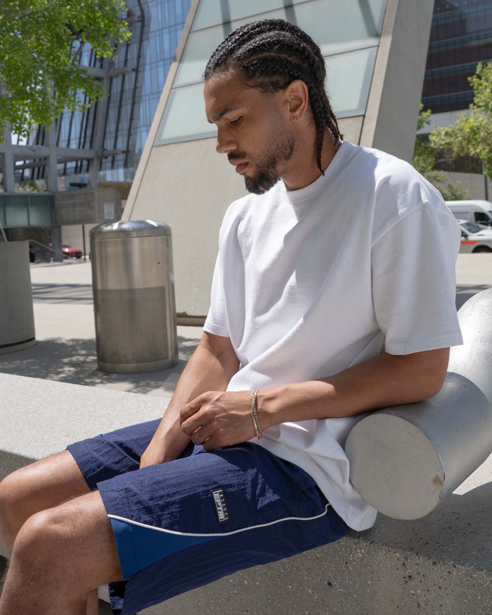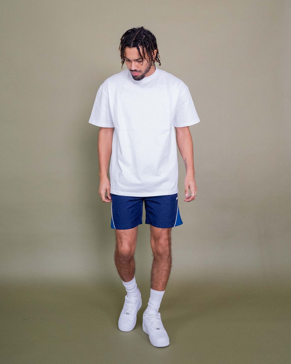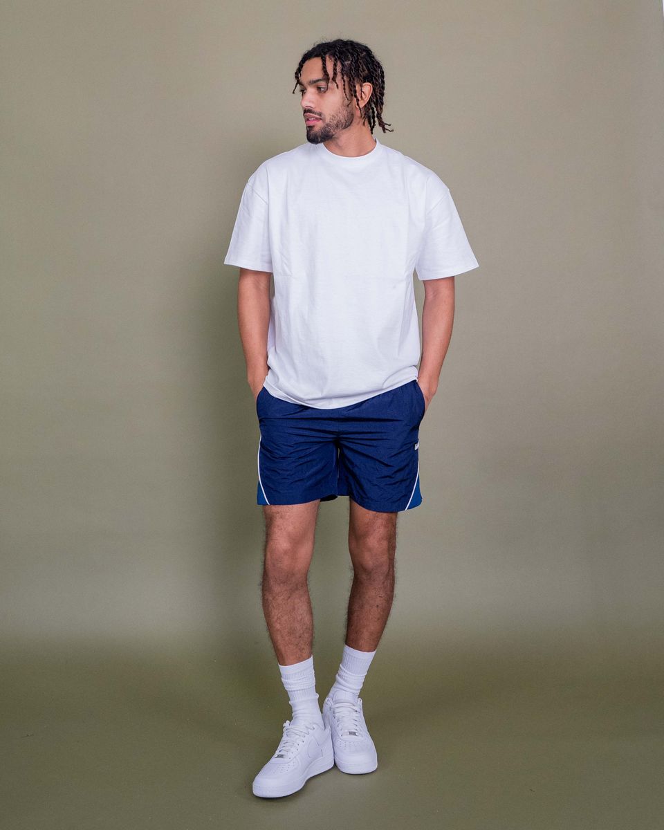 The Navy blue Derby Shorts boast mesh jersey contrast with white piping and dual hem splits at the legs.
