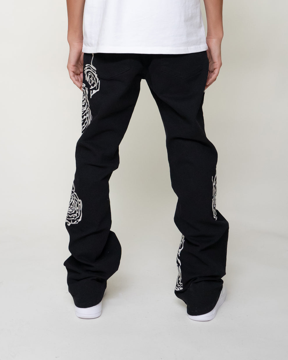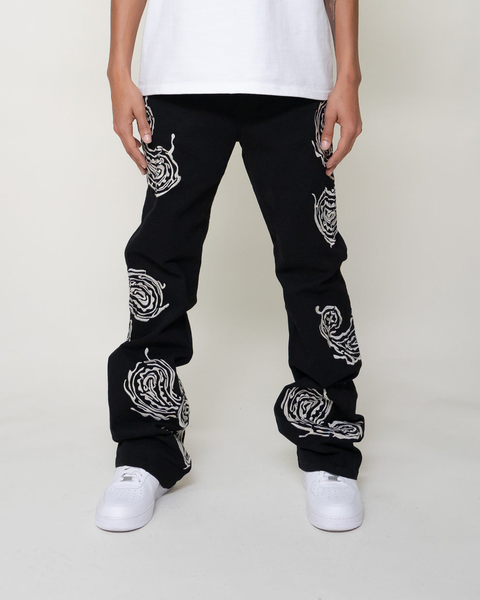 The Sequoia Flare Pants features abstract paisley embroidery through out. Made in a stretch twill with a flared leg opening.