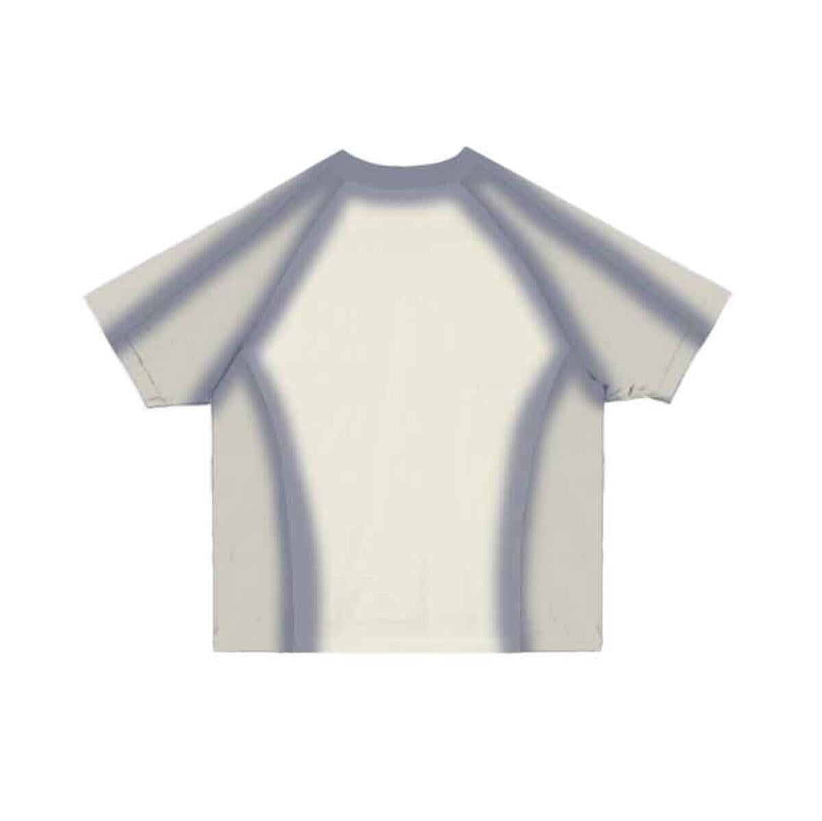 double layer raglan sleeve tee with raw edge seams and a spray dyed application over each seam