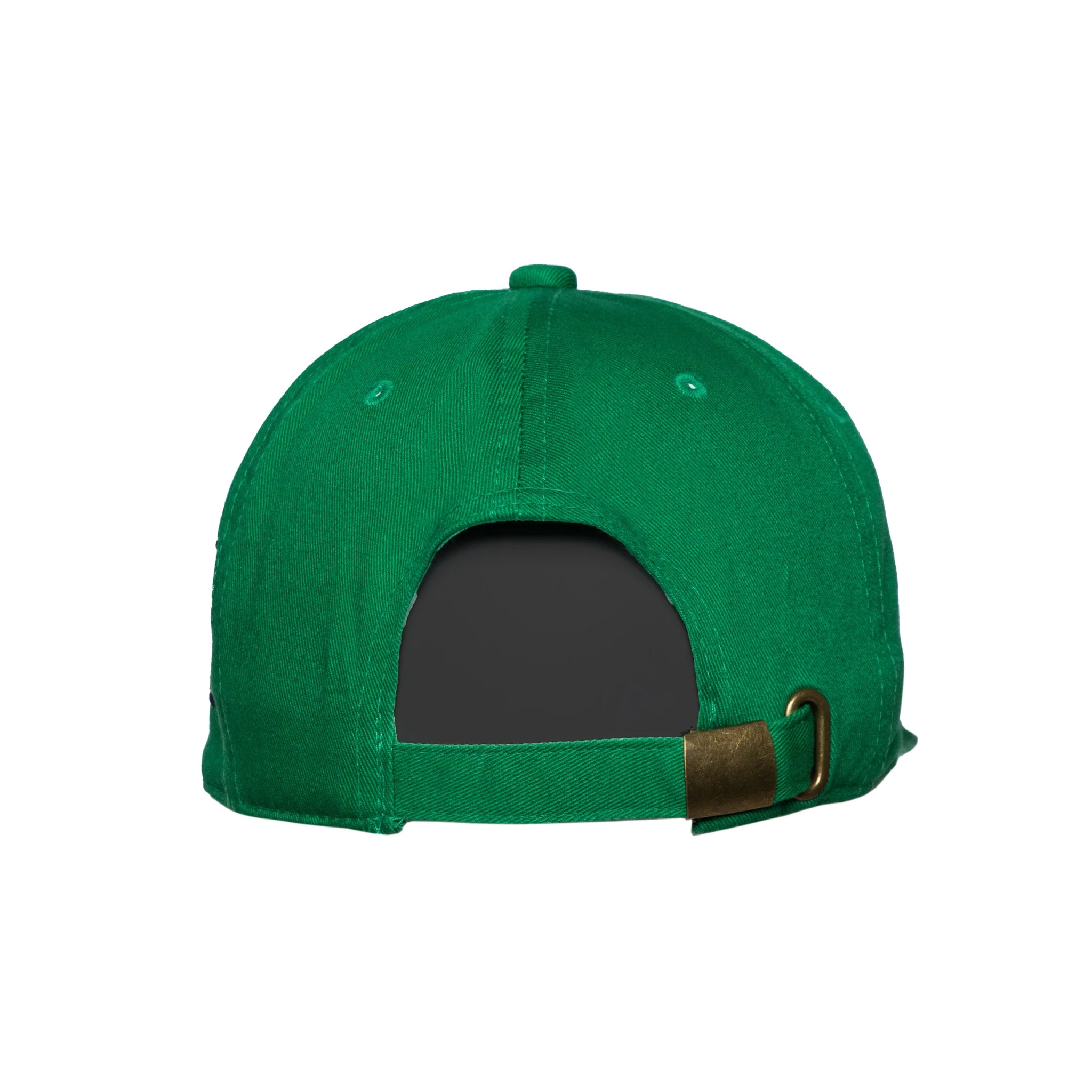 Unconstructed 5 panel in green. Embroidered 100% cotton 5-panel cap mid-profile , unconstructed matching fabric undervisor . Adjustable strapback ,front and side embroidery